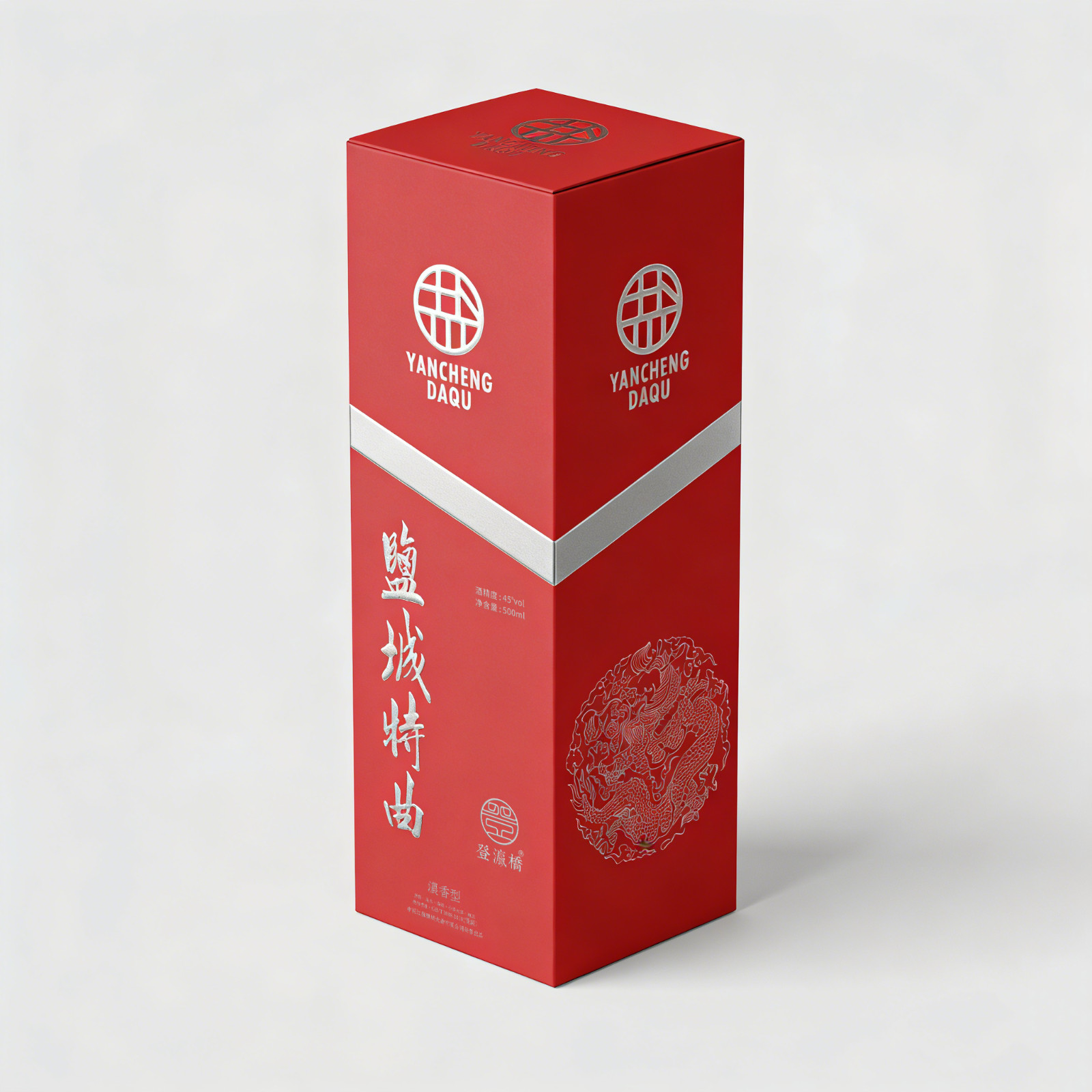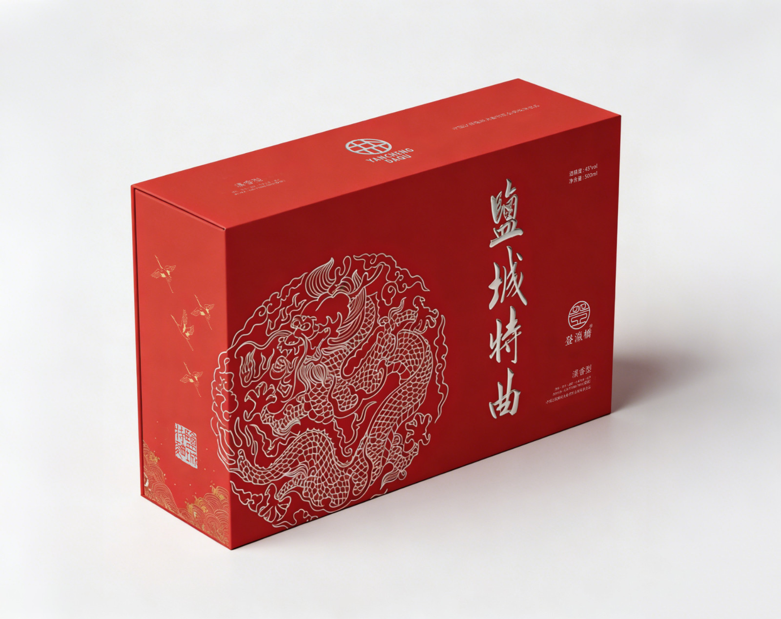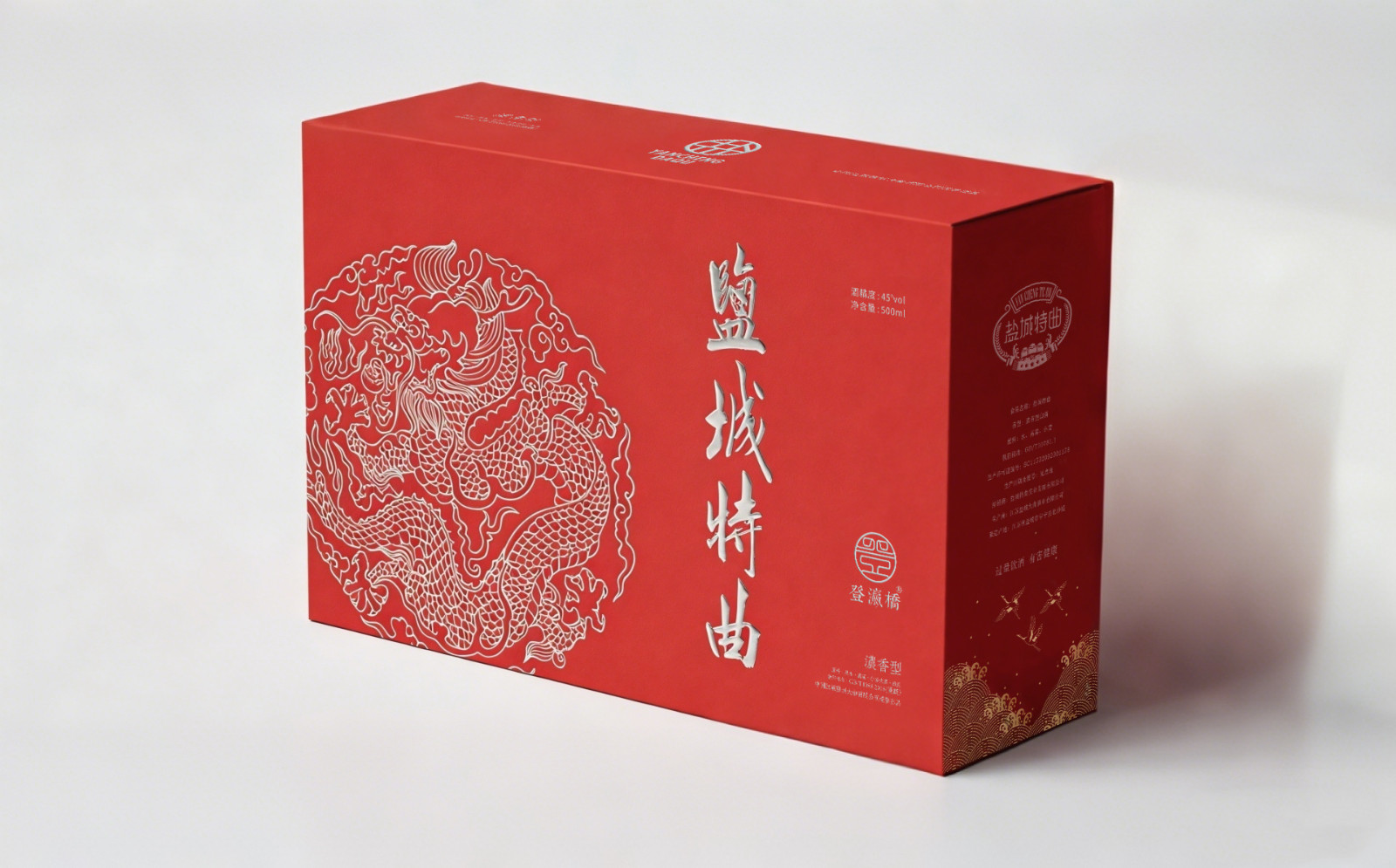 整体视觉系统以喜庆的中国红为主色,寓意吉祥与热情。包装主视觉采用经典的龙纹,彰显气度与品质尊贵;侧边辅以祥云、仙鹤等传统线描图案点缀,进一步烘托出福瑞盈门、岁月长久的东方美韵,从视觉到质感,全面诉说其遵循古法、醇厚无勾兑的纯正老酒故事。