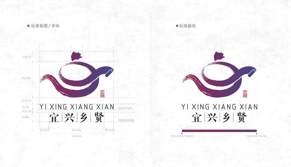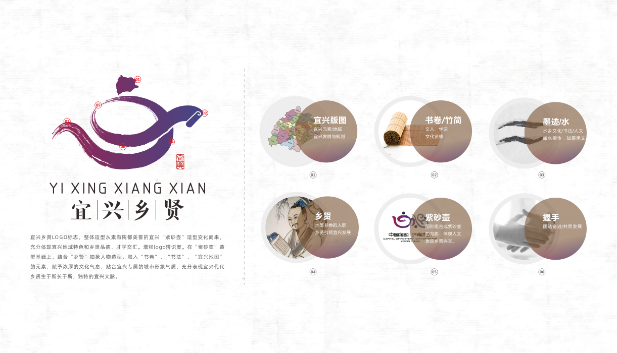 设计思路:宜兴市在外优秀人士视觉LOGO标志,整体造型从素有陶都美誉的宜兴“紫砂壶”造型变化而来充分体现宜兴地域特色和乡贤品德、才学交汇。增强logo辨识度。在“紫砂壶”造型基础上,结合“乡贤”抽象人物造型,融入“书卷”、“书法”“宜兴地图的元素,赋予浓厚的文化气息,贴合宜兴专属的城市形象气质,充分表现宜兴代代乡贤生于斯长于斯,独特的宜兴文脉。