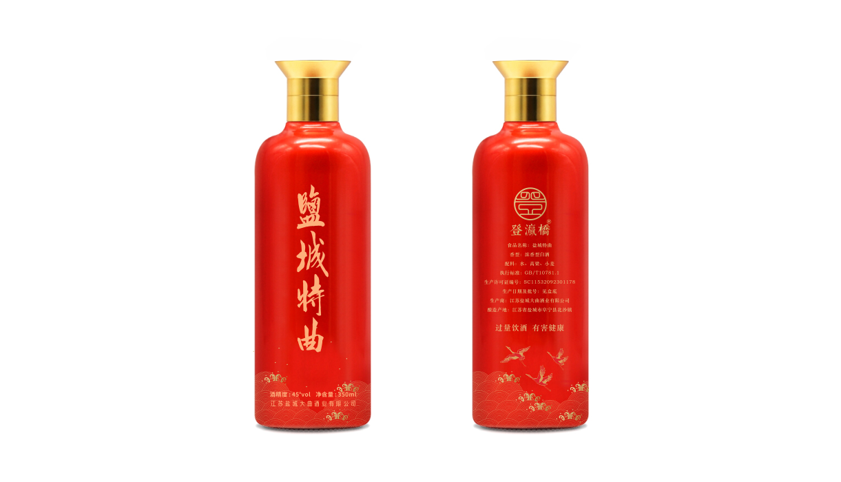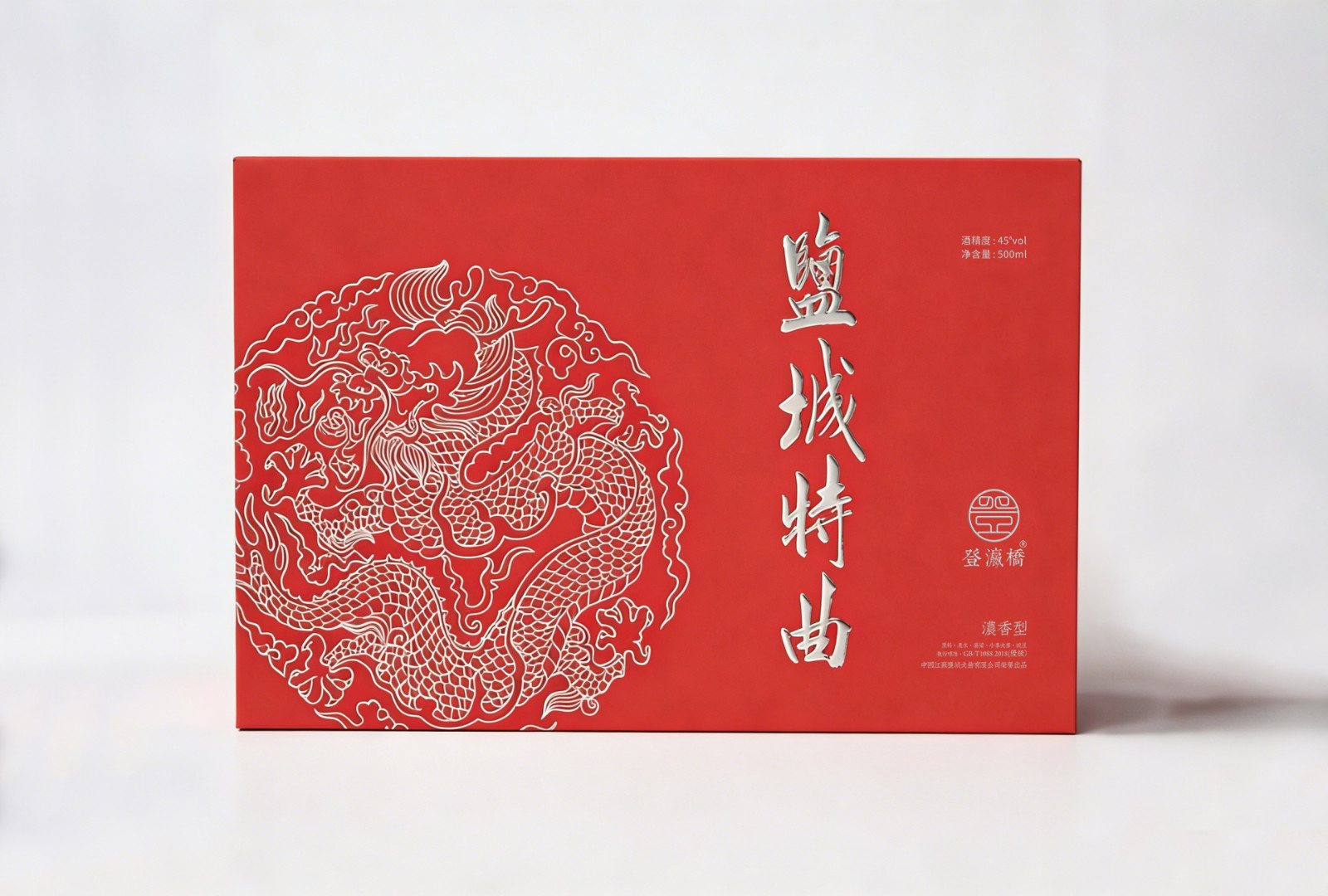整体视觉系统以喜庆的中国红为主色,寓意吉祥与热情。包装主视觉采用经典的龙纹,彰显气度与品质尊贵;侧边辅以祥云、仙鹤等传统线描图案点缀,进一步烘托出福瑞盈门、岁月长久的东方美韵,从视觉到质感,全面诉说其遵循古法、醇厚无勾兑的纯正老酒故事。